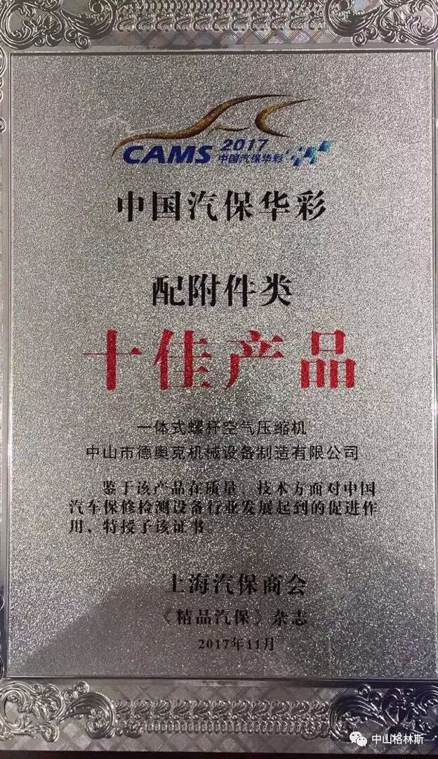 我司旗下公司中山市德奧克機(jī)械設(shè)備有限公司所生產(chǎn)的一體式螺桿空氣壓縮機(jī)獲得“配件類--十佳產(chǎn)品”稱號。
