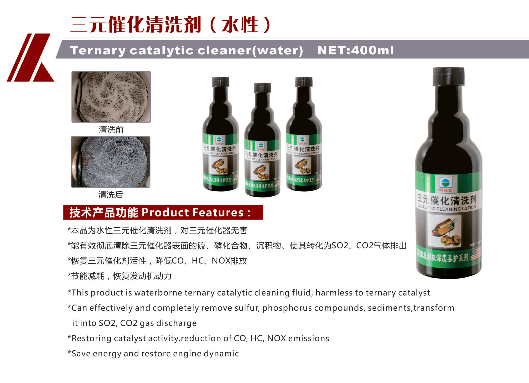 能有效徹底清除三元催化器表面的硫、磷化合物、沉積物、使其轉(zhuǎn)化為SO2、CO2氣體排出。